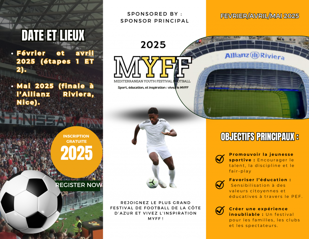 Avec ses trois รฉtapes clรฉs et son village MYFF , le Mediterranean Youth Festival Football nโest pas quโun tournoi : cโest le plus grand festival de football jeune sur la Cรดte dโAzur.